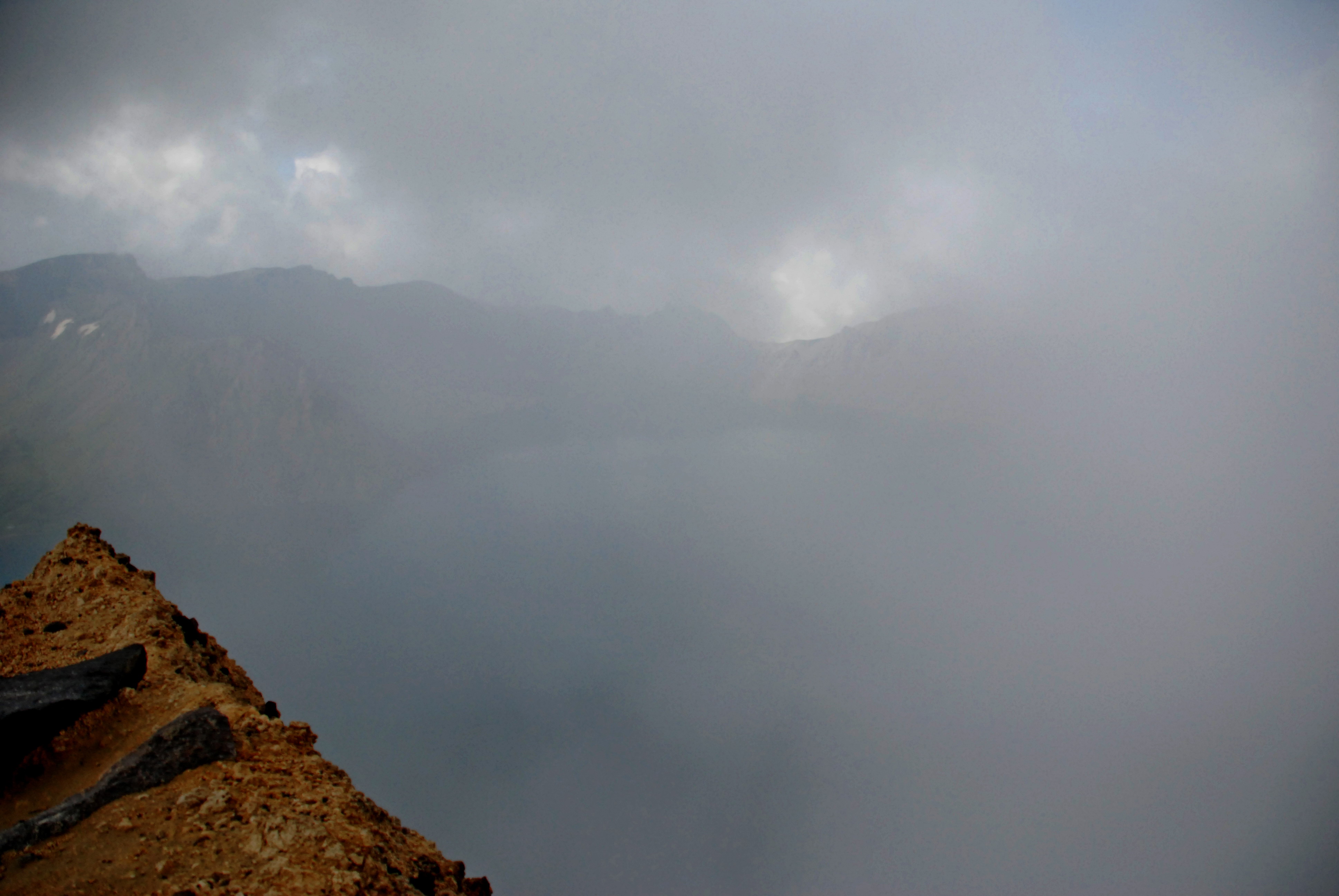 거센 바람이 불자 잠깐 사이에, 거짓말처럼 구름들이 몰려 지나가고, 천지가 시야에 들어왔다. 지나가는 구름 때문에 렌즈 초점이 잡히지 않고, 렌즈가 헛돌기만 해서, 참 난감했다. ' 똑딱이만도 못한 카메라라고 한탄하며, 안타까움에 식은땀만 흘렸다.