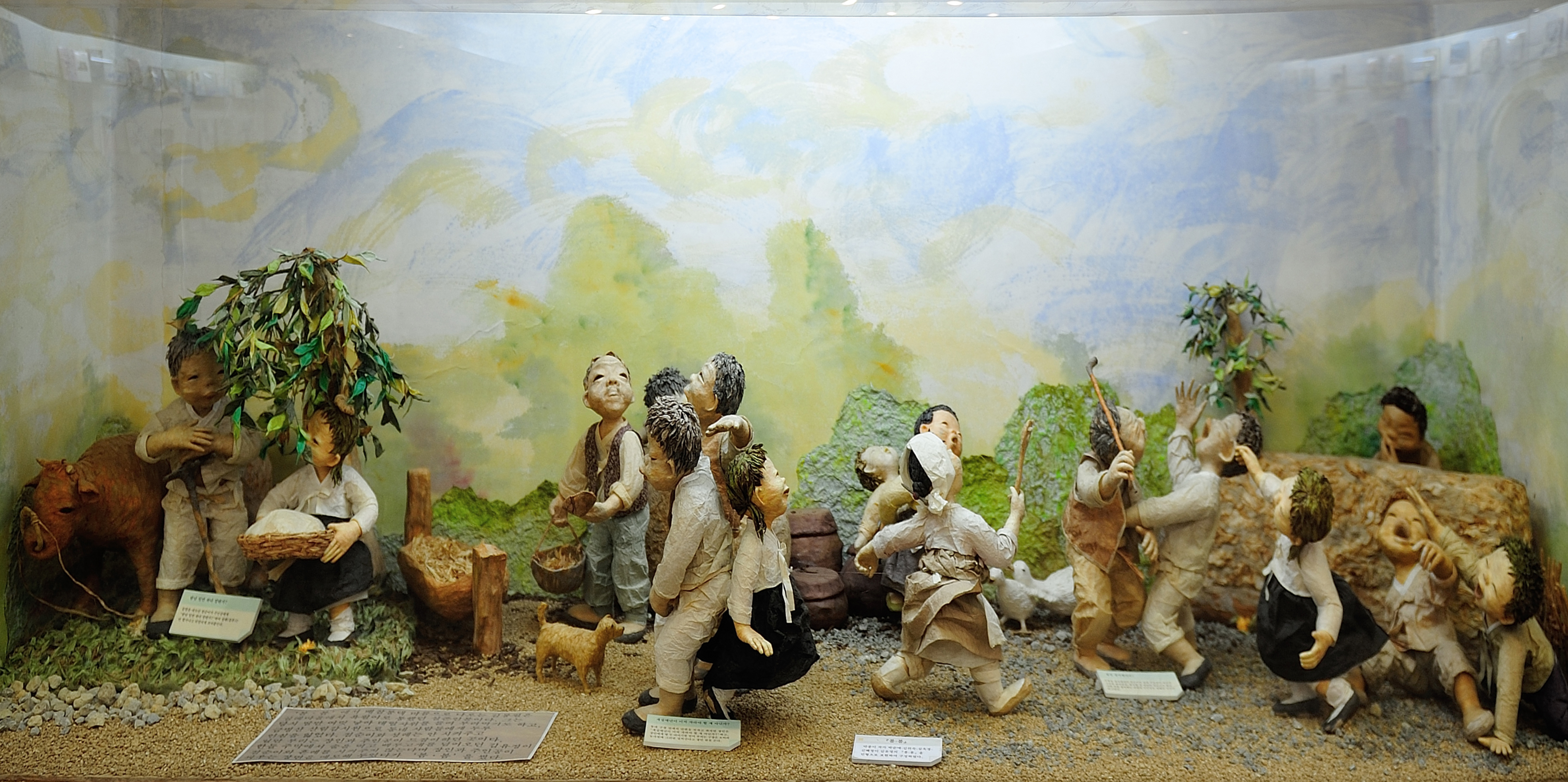 김유정문학관 전시실안에 있는 님의 단편소설 "봄봄"의 줄거리를 인형으로 재현한 인형마당입니다. 노총각 데릴사위가 장래 그의 아내가 될 점순이의 부추킴에 용기백배해서 영악한 봉필씨의 잔머리에 우직하게 대들다가 그만 점순이에게까지 혼나는 모양입니다.