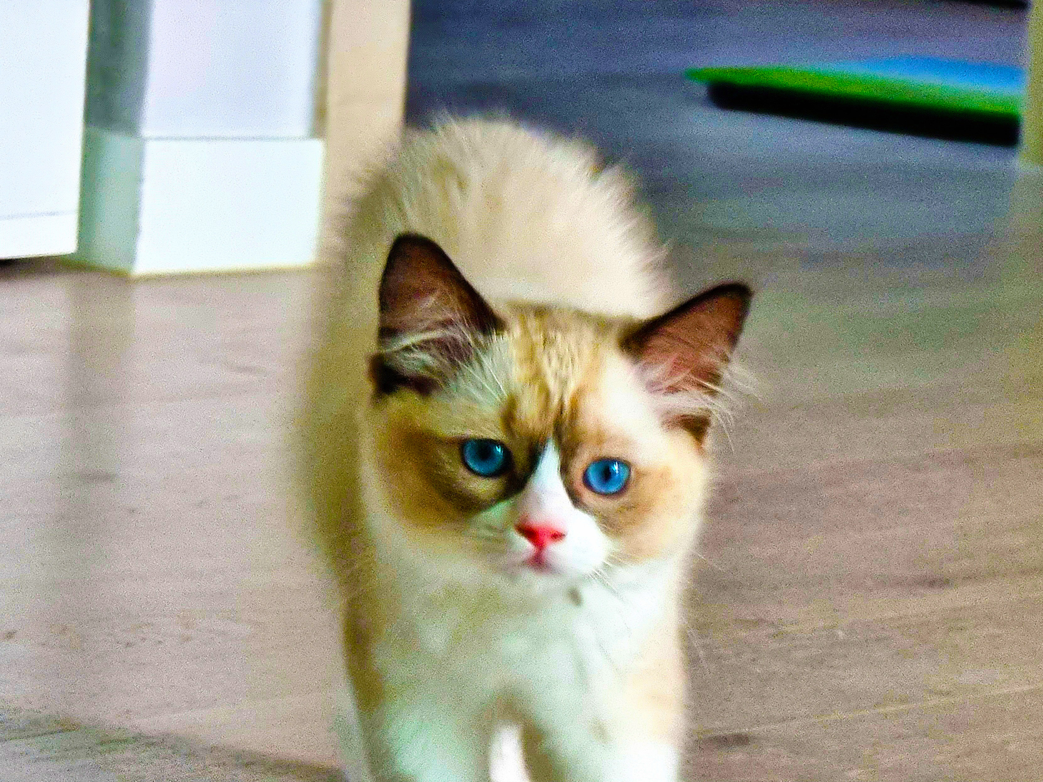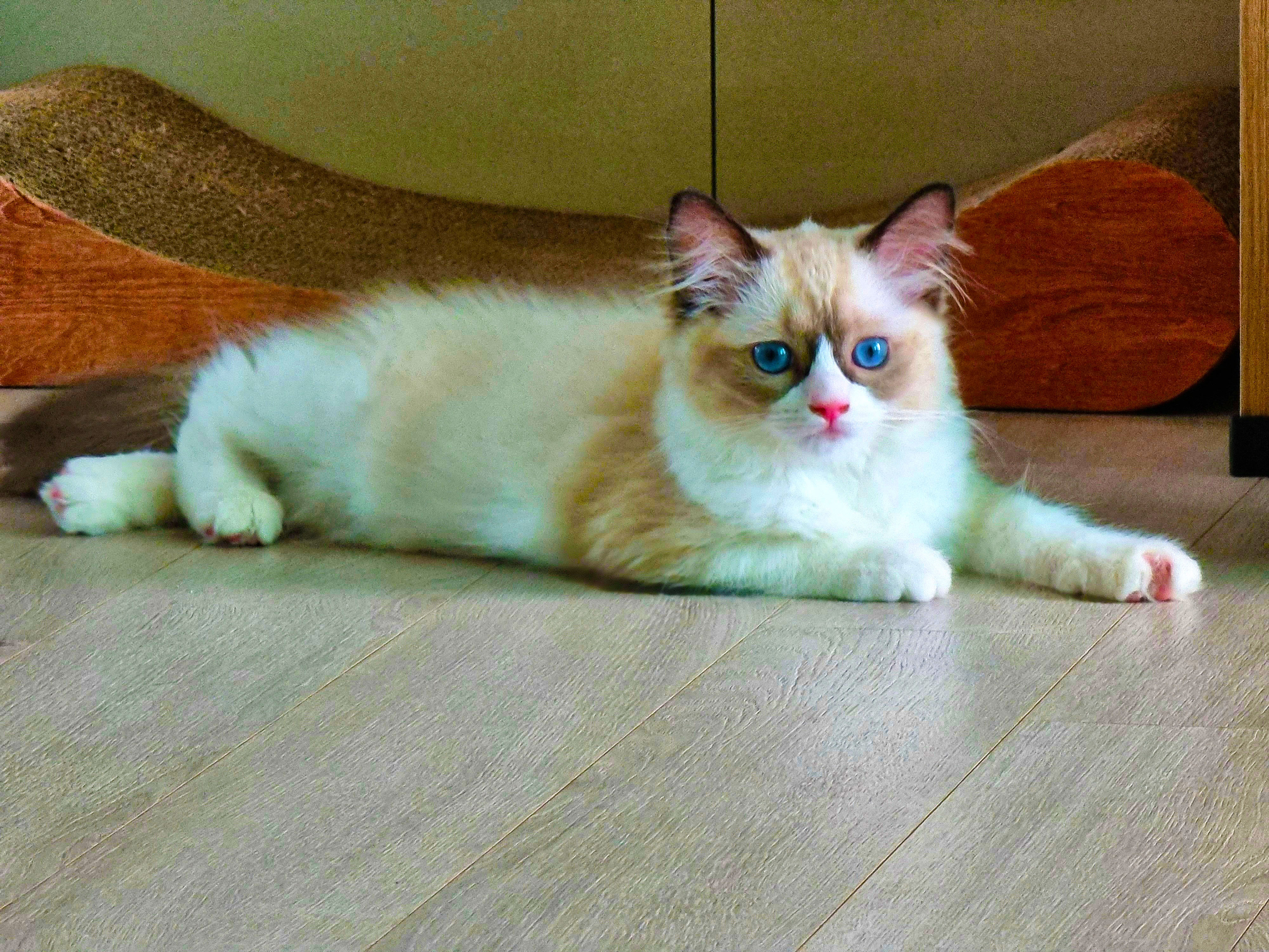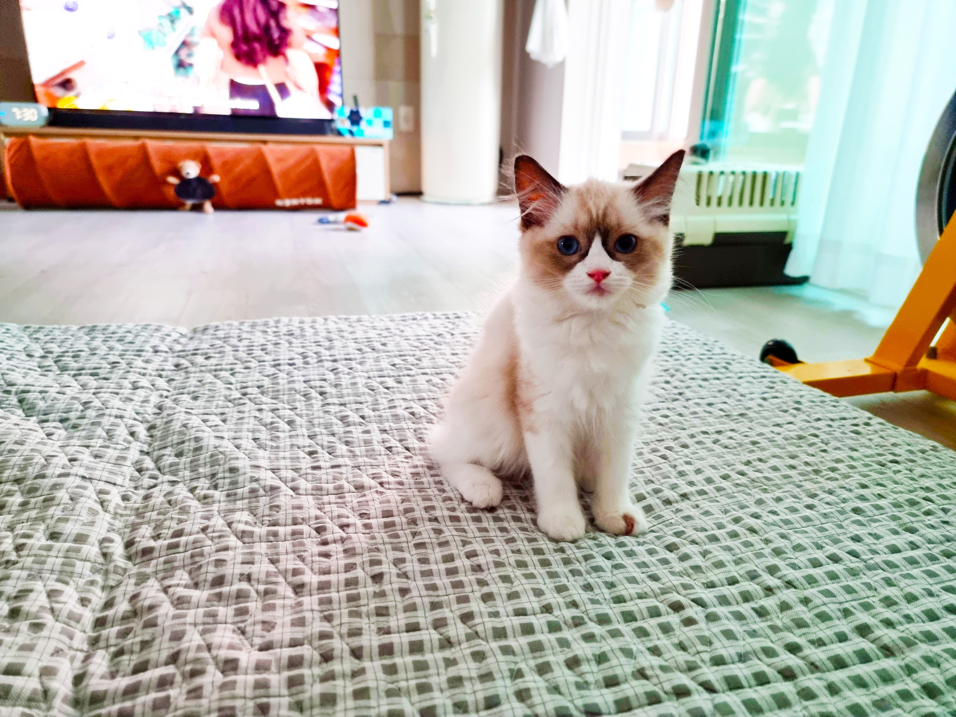 파란 눈의 고양이, 미국에서 개량한 품종 '렉돌'이다. 덩치가 커서 비만 고양이에 속하지만 성품이 유순하고 친화적이란다. 집에 들여온 녀석은 어린 탓인지 생기 발랄했다. 조석으로 까불고 사냥하듯 숨었다가 뛰어나와 장난감을 공격한다. 사냥본능이 뛰어나지만 호기심 많고 천진난만하다. 아직 한 번도 야옹하는 울음소리를 낸 적이 없다, 핸드폰으로 새끼 고양이 울음소리를 여러 번 들려줬는데, 관심이 대단했다. 자주 들려주면 야옹거릴까봐 그만 두었다. 시력은 좋지 않은 듯, 정지된 먹잇감은 잘 찾지 못하지만 동체 시각과 청각은 매우 예민하게 발달했다. 점프력도 좋고 대단한 몸놀림으로 거실을 제 영역으로 인식하고 좁다는 듯 뛰어다닌다. 한낮에는 어두운 구석을 찾아 숨어서 오붓하게 낮잠을 자며 제 방식의 삶을 즐기고 있다.