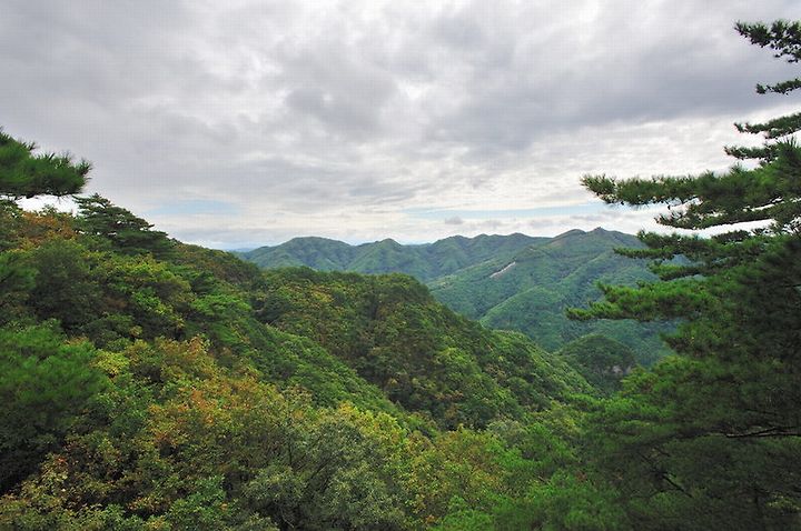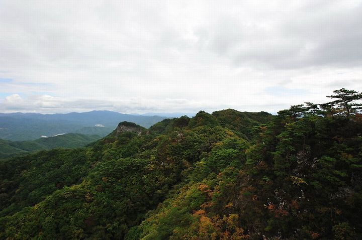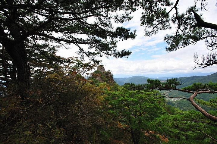 선학정에서 입석까지 이동, 하늘의 구름이 변화무쌍하다. 맑은 날을 기대했었는데, 몰려드는 구름이 심상치 않았다. 맞은 편 산봉 위에는 정자가 아름답게 앉아 있었다. 거리가 멀어 아득해 보였는데,사진으로는 너무 작게 나타난 것 같다.같이 간 사람들에 의하면, 산성의 누각이란다. 이 깊은 산속에까지 산성이 있었다니, 과거 이곳에도 전쟁의 화가 미쳤나 보다.