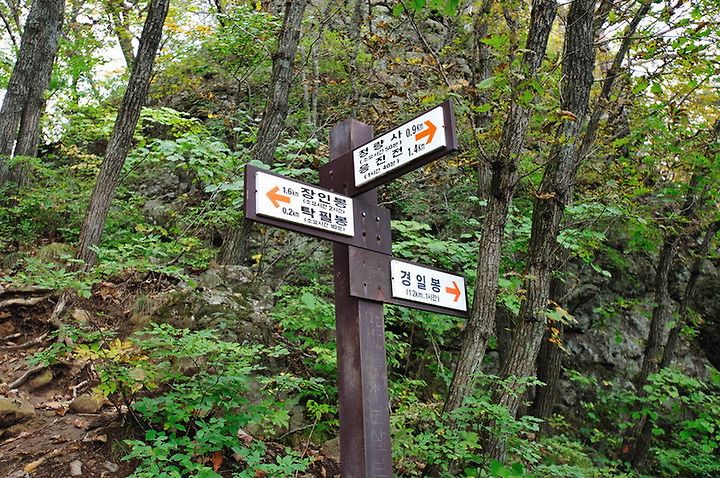 숲 사이 트인 곳으로 산봉우리가 보였다. 그 위(자소봉)에 서있는 사람들의 모습을 보고서야 비로소 높은 산 정위를 걷는다는 것이 실감났다. 나무만 보고 숲을 보지 못한다는 말이 이곳에서 떠올랐는데, 전망 좋은 산봉우리를 멀리서나마 보게 되니, 숲도 볼 수 있겠다는 생각이 들었다.