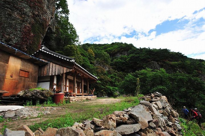 수행 중이라는 작은 푯말 하나가 담장에 걸려 있었다. 절벽에 붙은 담쟁이 색깔이 붉다. 그 아래 작은 맞배지붕의 도량이 매우 인상적이다. 그 옆으로는 대충 간단하게 임시로 지은 듯한 누옥이 이어져 있었다.