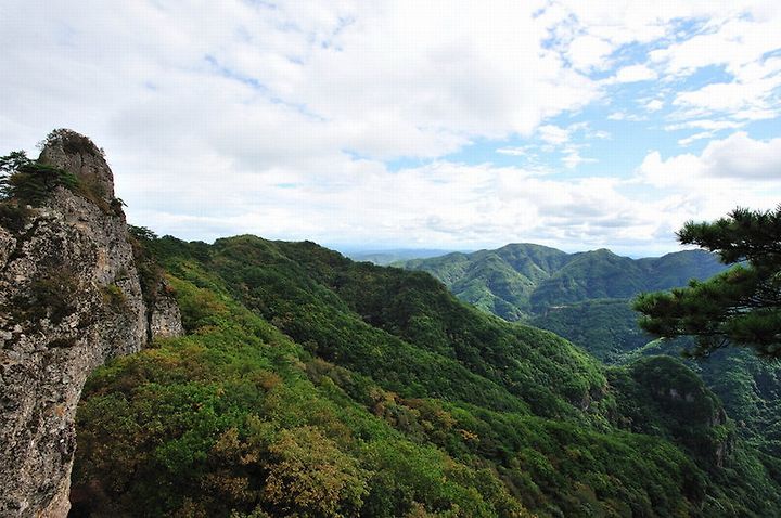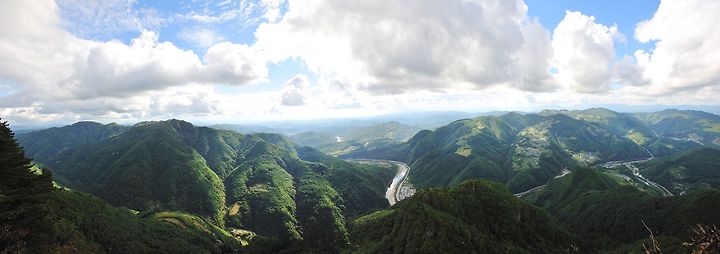 모퉁이 돌며, 탁 트인 벼랑위에서 아래를 내려다 보니, 수목 사이로 우리가 올라왔던 골짜기 도로가 뱀이 꿈틀거리는 것 처럼 보였다.하늘과 맞닿은 먼 산의 능선들도 시원한 모습이었다.