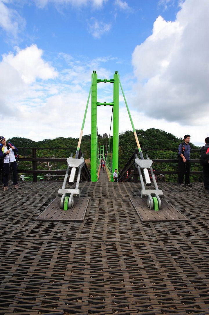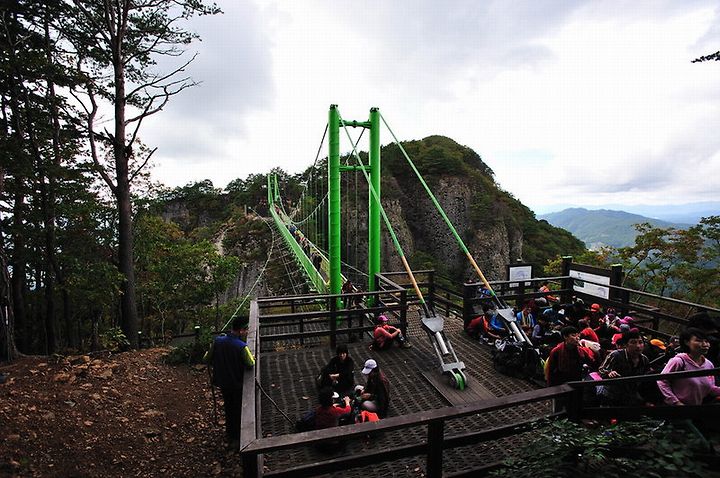 드디어 하늘다리. 이름이 멋있다. 청량산의 명물이다. 다리 입구에서 많은 사람들이 점심 식사를 하고 있었다. 계곡 사이를 건너질러 쇠줄로 매달아 놓은 철교였는데, 장관이었다. 월출산 구름다리와 사못 비견할 만 했다.