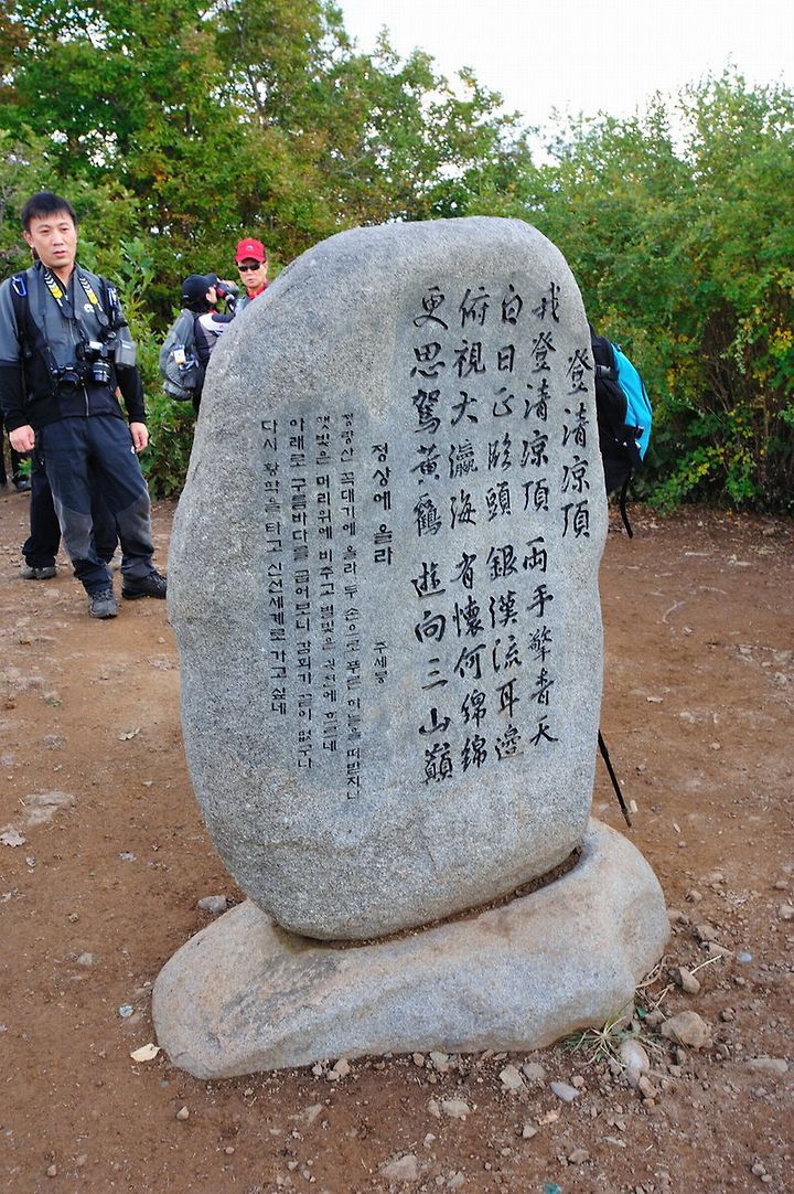 정상석의 뒷면, 조선 중종 때 인물로 소수서원을 창시했다는 주세붕 선생의 시가 적혀 있었다. 그러고 보면, 청량산이 있는 봉화가 영주, 풍기, 안동 지방과 가까워서 퇴계 선생을 비롯한 영남의유림들과 밀접한 연관이 있었겠다. 인자(仁者)는 요산요수(樂山樂水)라 했으니, 이 아름다운 청량산을 그냥 지나쳤을 리 없었겠다. 주세붕 선생은 청량산 장인봉에 올라 도학자를 꿈꾸었나 보다. 신선의 몸으로 인간세계에 귀양왔다가 도를 깨치고는 다시 학을 타고 신선이 되어 하늘에 오른다는 시구절로 미루어 조선시대 양반들의 이상적 생활이 바로 아름다운 산을 찾아 풍류를 즐기는 것이었겠다. 송강 정철도 관동별곡 끝부분에서 자신을 인간세계로 귀양 내려 온 신선으로 묘사하고 있으니 말이다.