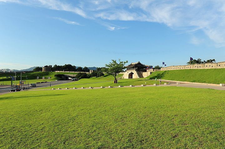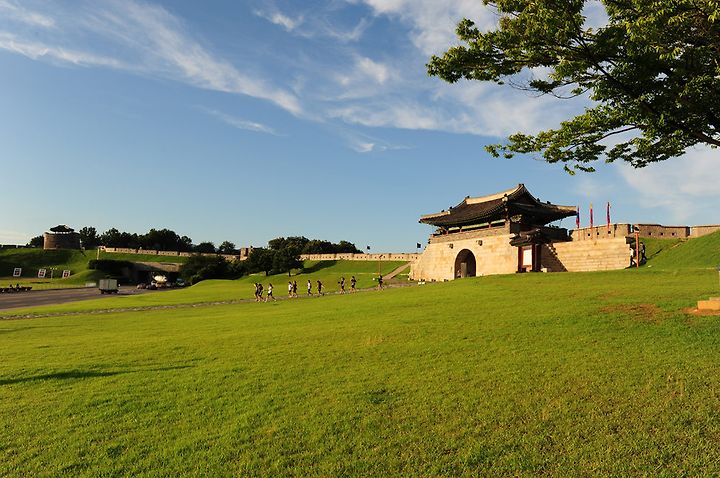 수원 화성의 동문인 창룡문입니다. 모처럼 맑은 날 오후, 가시거리가 꽤 나올 것 같습니다. 성안 왼편의 활터가 연무대, 성밖 뒤쪽으로 멀리 보이는 산이 광교산입니다.