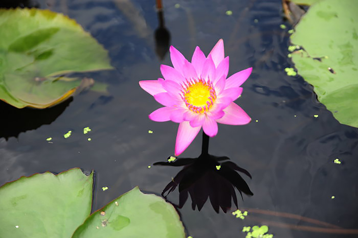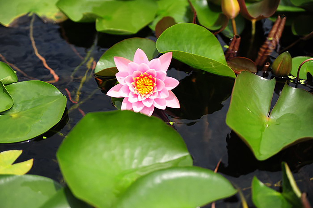 연꽃의 덕성은 첫째, 처렴상정이랍니다. 연꽃은 깨끗한 물에서는 살지 않습니다. 더럽고 추하게 보이는 물에 살지만, 그 더러움을 자신의 꽃이나 잎에는 묻히지 않는 답니다. 이것은 마치 불자가 흙탕물과 같은 세속의 더러움에 빠져 있어도, 세상의 더러움에 물들지 않고 오직 부처님의 가르침을 받들어 아름다운 자비심의 꽃을 피우는 것과 같답니다. 우리도 흔히 속세라고 말하는 세상을 맑고 향기롭게 하는 존재들이 되었으면 하는 바람이 있고요. 두 번 째는 화과동시랍니다. 화과동시는 꽃과 열매가 동시에 맺힌다는 의미입니다. 보통의 식물들은 꽃이 지고 나서 열매가 맺히지요. 연꽃은 꽃이 핌과 동시에 열매가 그 속에 자리를 잡습니다. 이것을 '연밥'이라 하는데, 즉 꽃은 열매를 맺기 위한 수단이며 열매의 원인인 것이랍니다. 그런데, 세상사의 이치는 원인에 따라 결과가 생기게 마련인데, 연꽃은 원인과 결과가 동시에 진행되는 것이지요. 원인이 결과를 만들고, 결과가 다시 원인을 만든다는 것입니다. 그래서 이를 인과동시라고도 합니다. 이 꽃과 열매의 관계를 인(因)과 과(果)의 관계라 할 수 있으며 인과의 도리는 곧 부처님의 가르침이랍니다.